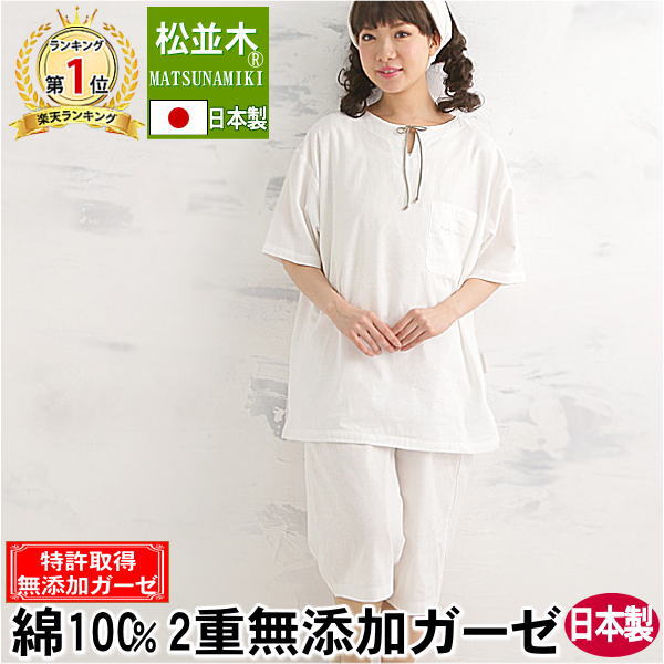 楽天1位【送料無料】ガーゼ パジャマ 半袖・半ズボン 2重無添加ガーゼ 日本製 オフホワイト レディース メンズ 綿100% 松並木 ヌーディコットン ナイティ ナイトウエア 部屋着 寝巻き 敏感肌 アトピー 汗対策 肌にやさしい 無添加ガーゼパジャマ 入院介護 夏 贈り物
