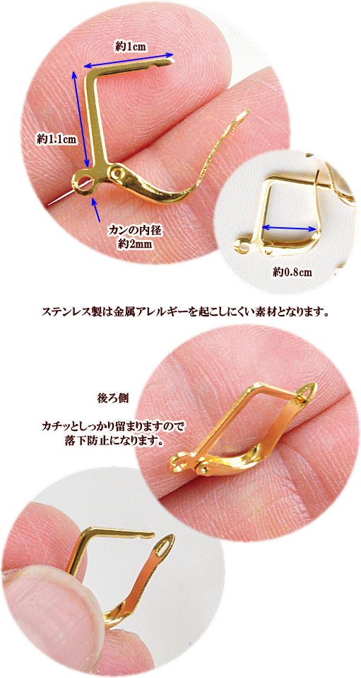 (例:1Mを5枚に分けて、1M・2Mを1枚ずつ、など)金属アレルギーも起きにくいサージカルステンレス製フレンチフックピアス ゴールド 5ペア10個フレンチフックはキャッチ部分がカチッとしっかり留まりますので、落下防止のピアスパーツとしてオススメです。