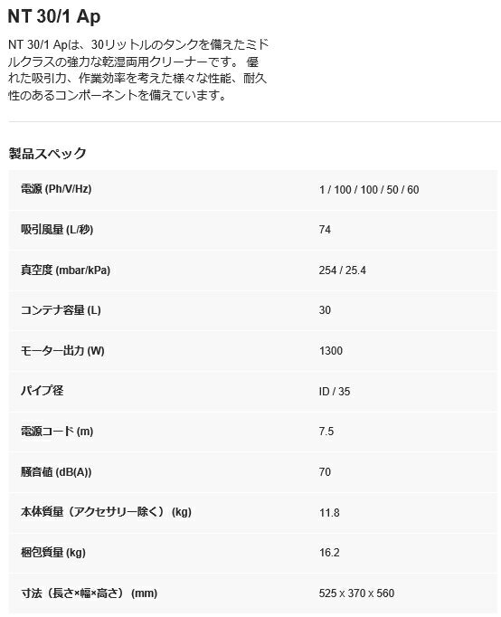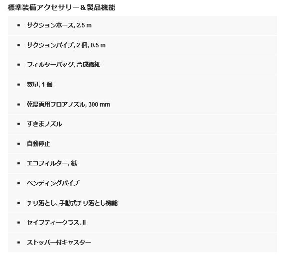 電源 単相 100V 50/60 HZ共用 モーター出力 1300W 真空度 254mbar/25.4kPa 吸引風量(L/秒) 74 タンク容量 30L 本体重量 11.8kg 本体寸法mm(LWH) 525×370×560 標準装備 サクションホース, 2.5 m・サクションパイプ, 2 個, 0.5 m・フィルターバッグ, 合成繊維 乾湿両用フロアノズル, 300 mm・すきまノズル エコフィルター, 紙・ベンディングパイプ